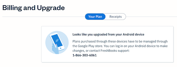 In your Billing and Upgrade section, if your account has a notification indicating "Looks like you upgraded from your Android device", your FreshBooks account is on a Google Play Subscription.