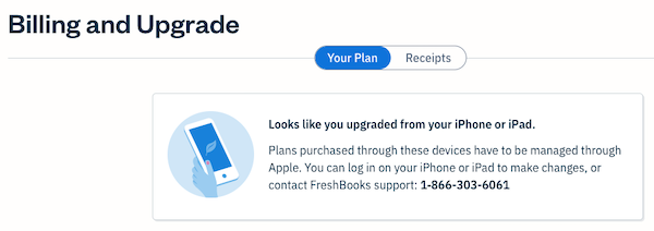 In your Billing and Upgrade section, if your account has a notification indicating "Looks like you upgraded from your iPhone or iPad", your FreshBooks account is on an Apple Subscription.