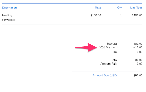 Discounts are a great way to reward your prompt clients, or encourage client loyalty with your work by giving them a deduction from the usual cost of your items or services. A discount can be applied as a percentage-based discount to the entire invoice, or as a flat rate on a specific line item.