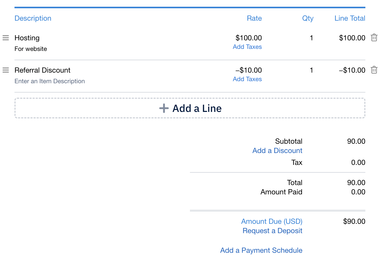 - Add a new item to represent your discount, and in the Rate field, enter the discount amount with a - (minus symbol) in front