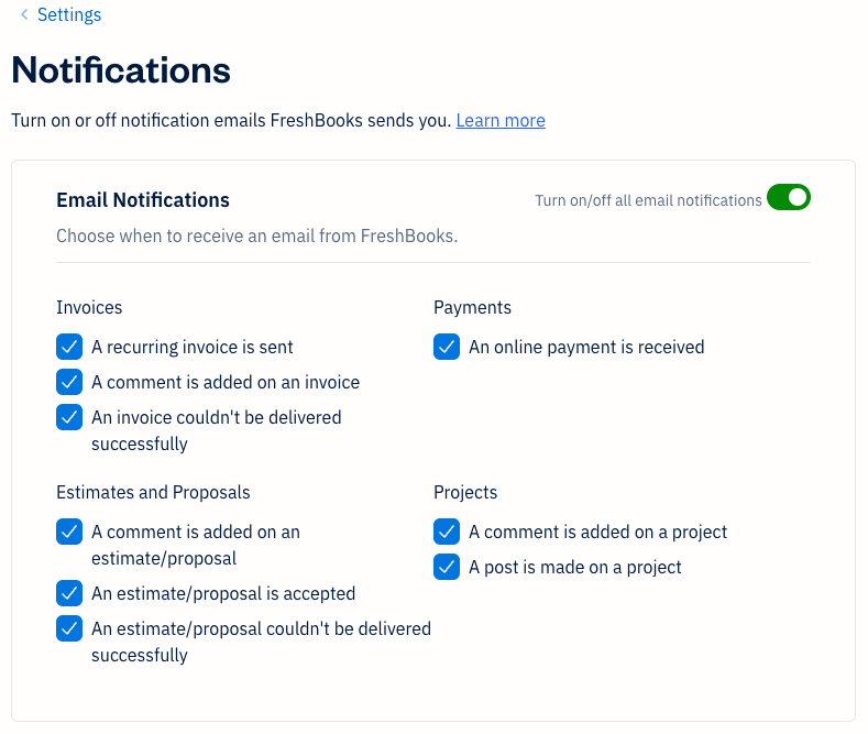 Or check off the box to receive, or uncheck the box to stop receiving, next to any of these email notifications: