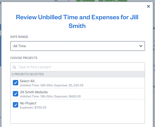 5. In the Review Unbilled Time for [Client] pop-up, under Date Range, select the dropdown and choose from All Time, This Month, Last Month, or Custom