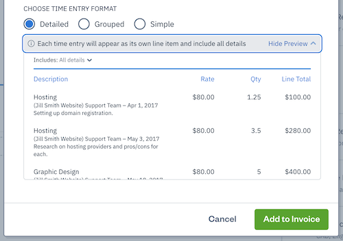 8. Then for Choose Time Entry Format section, choose between Detailed, Grouped, or Simple for how you want your time entries to appear on the Invoice - time entries are added in chronological order. Select Show Preview for a preview of your time entries by a particular format: