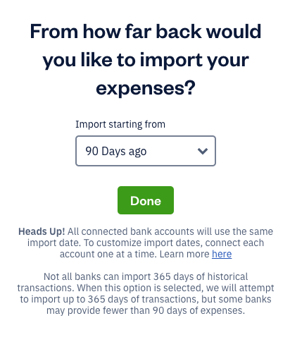 - A pop-up will ask you to how far back to import expenses from - choose between Today, 7 Days ago, 30 Days ago, 90 Days ago, 2 Years Ago, or Custom
