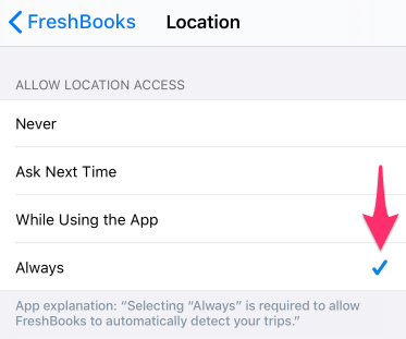- The Always setting allows you to place the FreshBooks iOS app in the background and turn the screen off without disrupting your mileage tracking