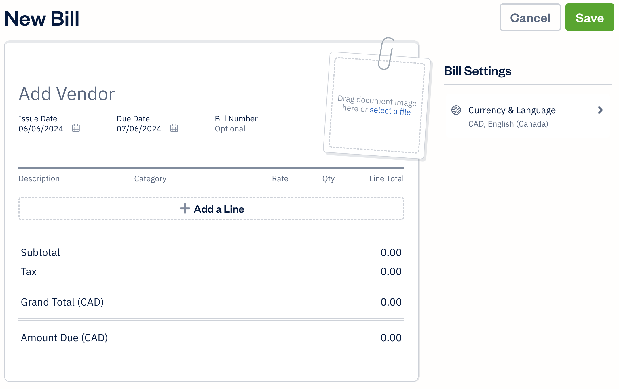 You’ll be taken to the New Bill screen: