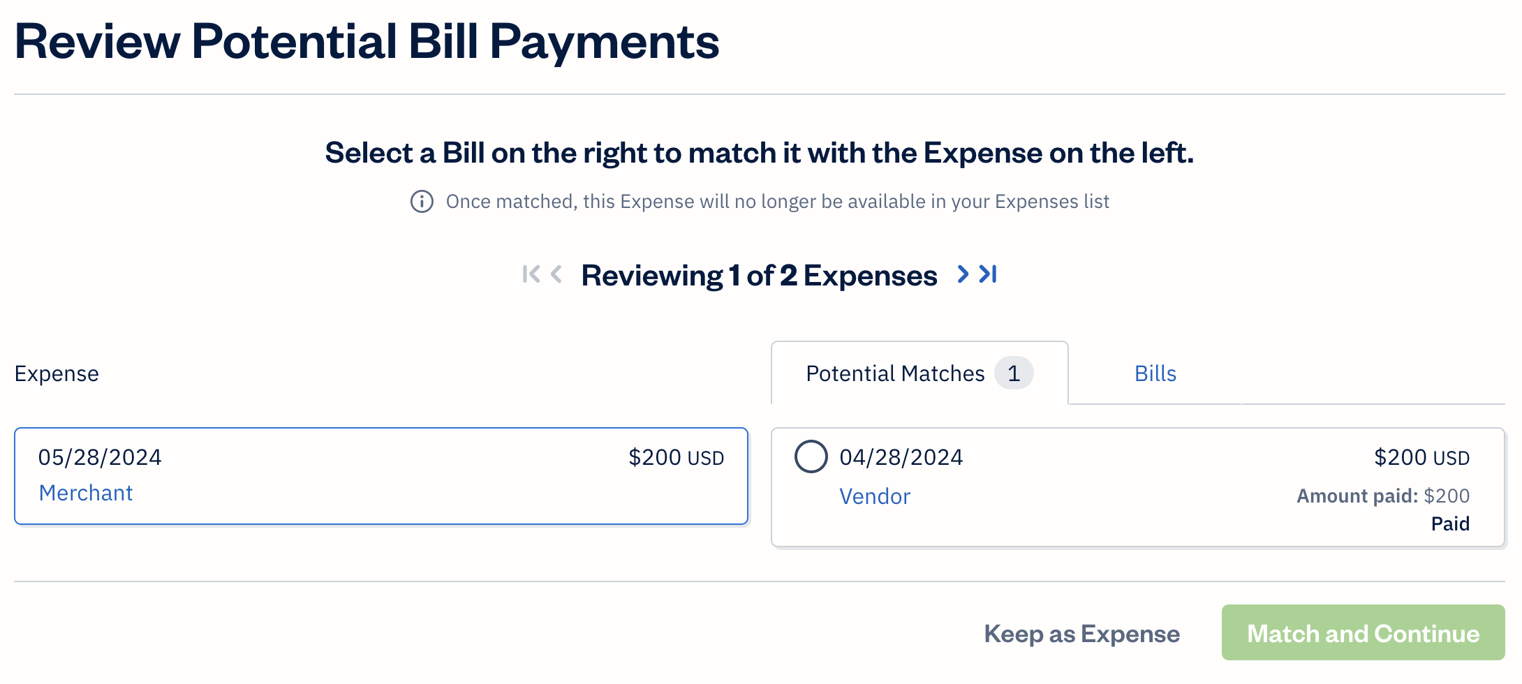 - Select the Match and Continue button until all expenses have been matched to bills or marked as expenses.
