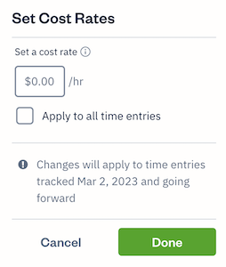 - To update the cost rate for all past time entries, ensure Apply to all time entries is checked off when updating the cost rate